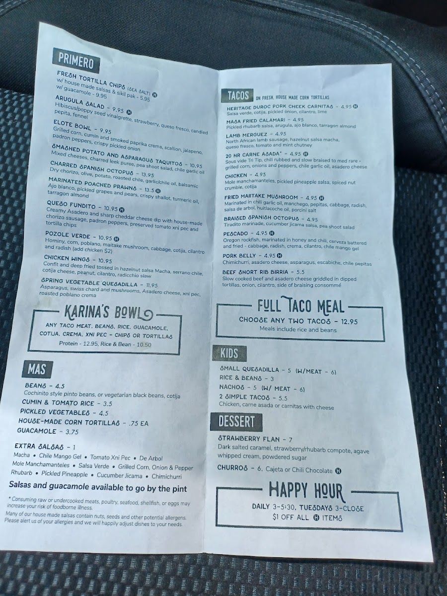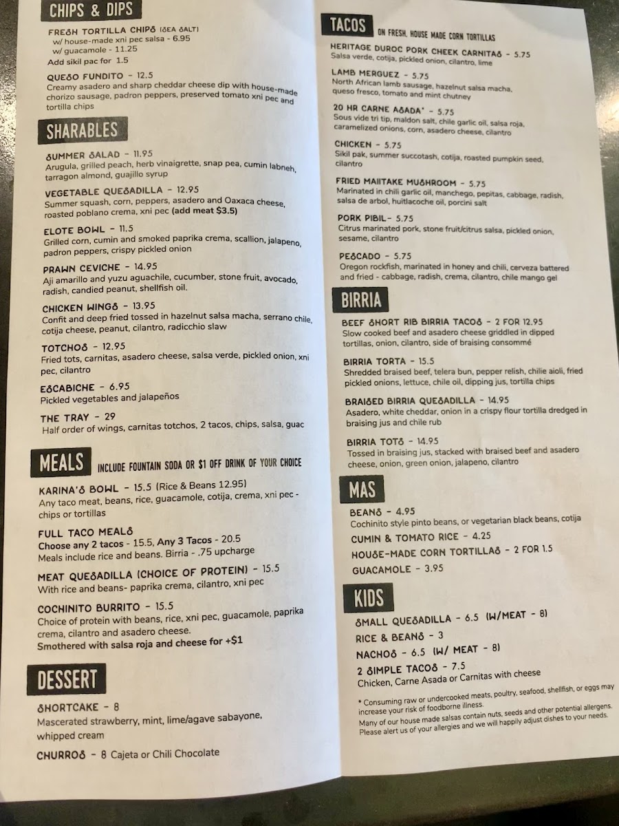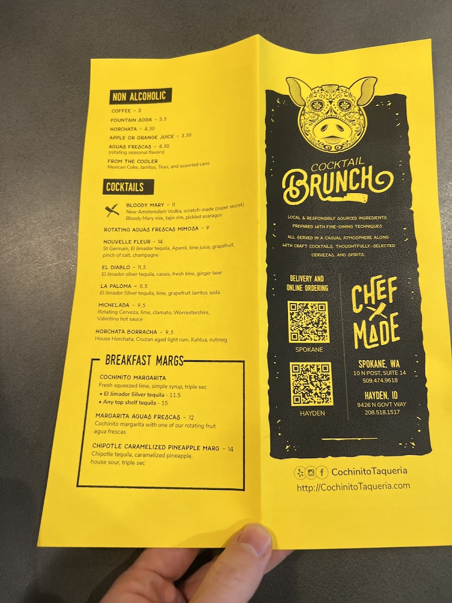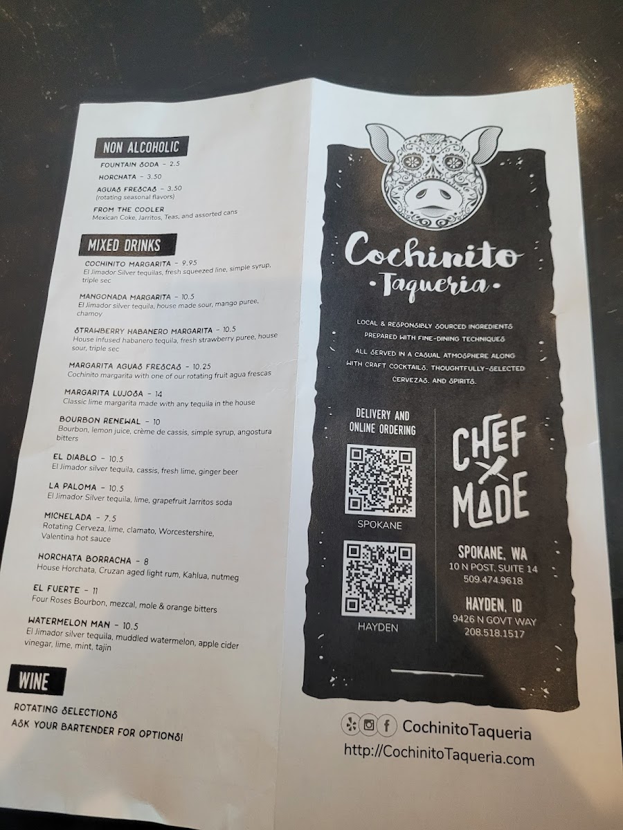 The menu at Cochinito Taqueria in Hayden comes together as a confident showcase of Mexican-inspired comfort food balanced with playful creativity, making it easy to see the restaurant’s identity through its dishes alone. Rich, slow-cooked flavors define standouts like Heritage Duroc Pork Cheek Carnitas and Pork Belly Pibil, both highlighting a deep respect for traditional techniques, while approachable favorites such as Street Tacos, Two Tacos, and the bold Lamb Merguez and Pescado Tacos provide variety for different tastes. Hearty options like the Cochinito Burrito, Birria Torta, Elote Bowl, and Karina's Bowl give the menu substance, offering satisfying combinations that feel filling without being heavy. For sharing or starting a meal, items like Salsa and Chips, Chips and Guacamole, Queso Fundito, Queso Cheese Dip, Nachos, and the intriguingly named Hazelnut Salsa I Think add texture and contrast, reinforcing the social, taqueria-style dining experience. Desserts and sweets are kept concise yet memorable, with Churros delivering a familiar finish and Mezcal Butterscotch Pudding adding a more adventurous, grown-up note. The beverage selection rounds things out effectively, from the refreshing Prickly Pear Margarita to classic options like the Bloody Mary and the creamy, dessert-like Horchata Rumchata, all of which complement the savory menu well. Taken together, the menu feels thoughtfully curated, blending traditional flavors with modern twists and creating a cohesive, satisfying impression that reflects both consistency and creativity across every category.