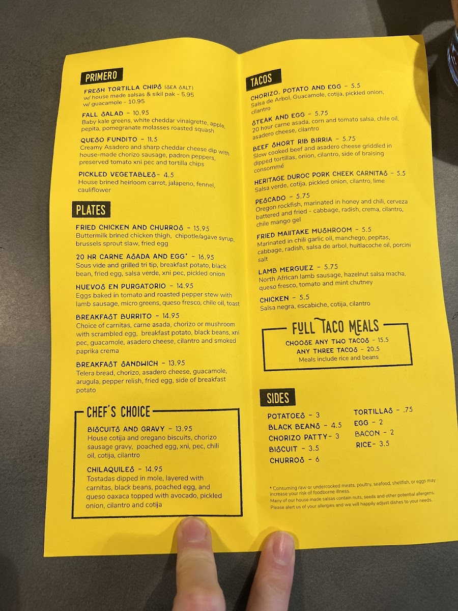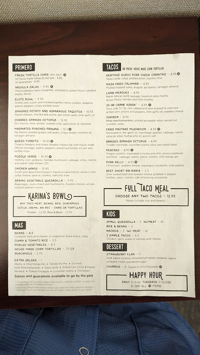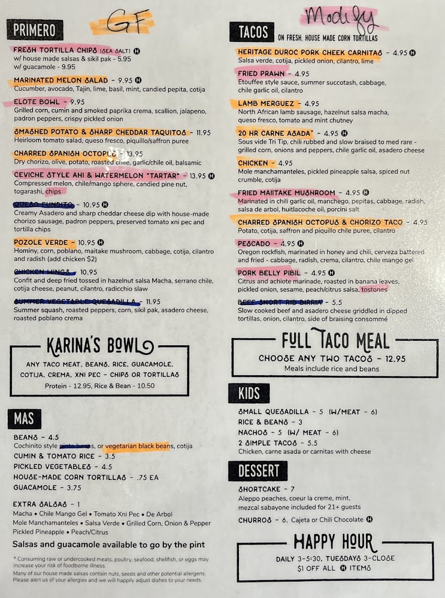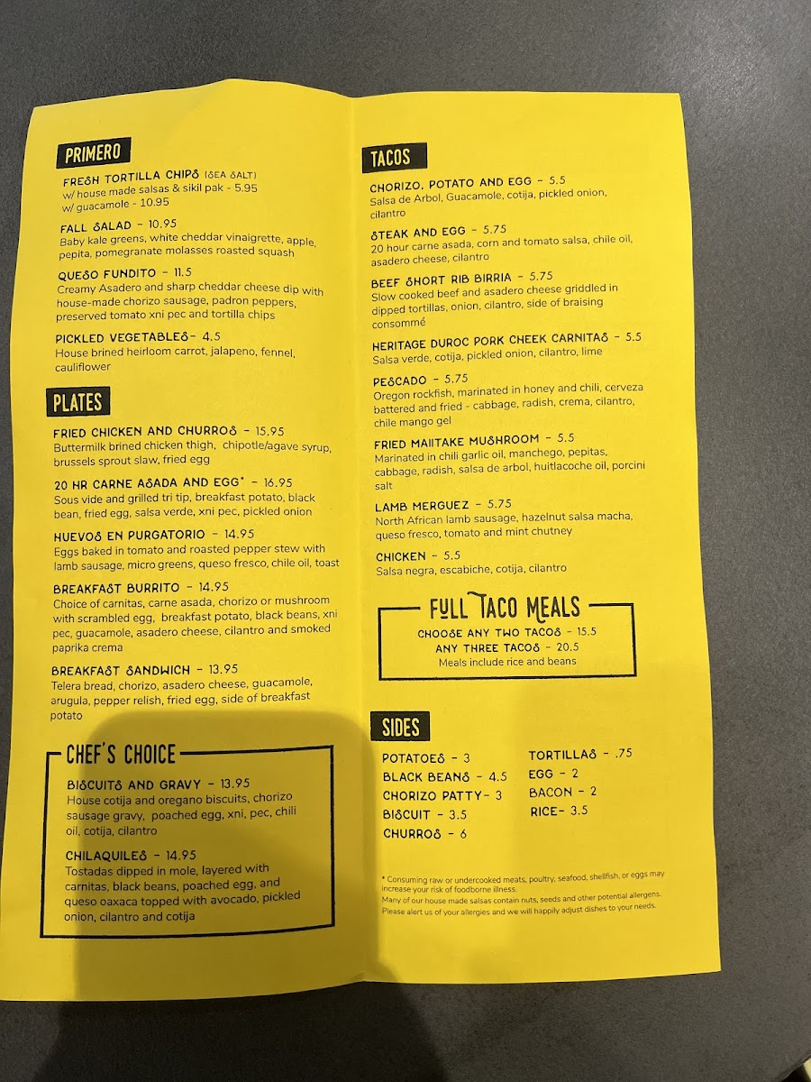The menu at Cochinito Taqueria in Hayden comes together as a confident showcase of Mexican-inspired comfort food balanced with playful creativity, making it easy to see the restaurant’s identity through its dishes alone. Rich, slow-cooked flavors define standouts like Heritage Duroc Pork Cheek Carnitas and Pork Belly Pibil, both highlighting a deep respect for traditional techniques, while approachable favorites such as Street Tacos, Two Tacos, and the bold Lamb Merguez and Pescado Tacos provide variety for different tastes. Hearty options like the Cochinito Burrito, Birria Torta, Elote Bowl, and Karina's Bowl give the menu substance, offering satisfying combinations that feel filling without being heavy. For sharing or starting a meal, items like Salsa and Chips, Chips and Guacamole, Queso Fundito, Queso Cheese Dip, Nachos, and the intriguingly named Hazelnut Salsa I Think add texture and contrast, reinforcing the social, taqueria-style dining experience. Desserts and sweets are kept concise yet memorable, with Churros delivering a familiar finish and Mezcal Butterscotch Pudding adding a more adventurous, grown-up note. The beverage selection rounds things out effectively, from the refreshing Prickly Pear Margarita to classic options like the Bloody Mary and the creamy, dessert-like Horchata Rumchata, all of which complement the savory menu well. Taken together, the menu feels thoughtfully curated, blending traditional flavors with modern twists and creating a cohesive, satisfying impression that reflects both consistency and creativity across every category.